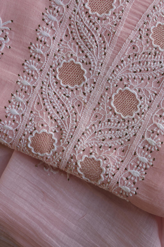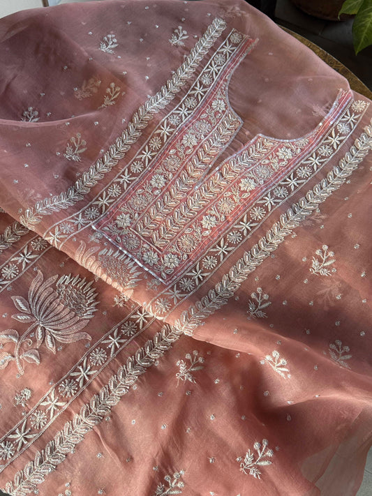 Peach Shade Organza Silk Chikankari Unstitched Fabric