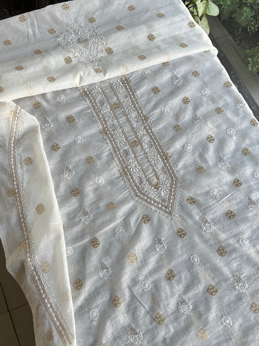 Golden & Off White Zari Chanderi Unisex Chikankari Unstitched Men’s Kurta Fabric