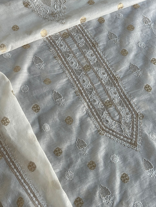 Grey Shade Tissue Silk Chikankari Kalidaar Kurta Dupatta Set