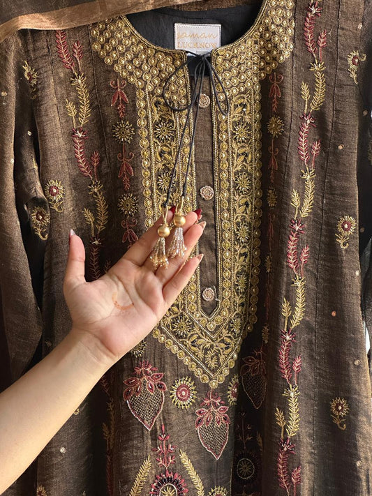 Goldish Black Shade Tissue Silk Chikankari Anarkali With Ari Work