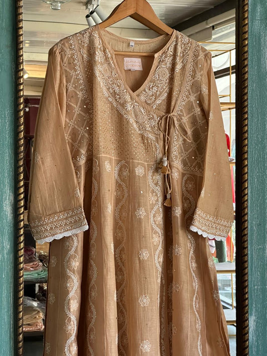 Natural Beige Shade Malmal Mukaish Kamdani Chikankari Kalidar Angarkha