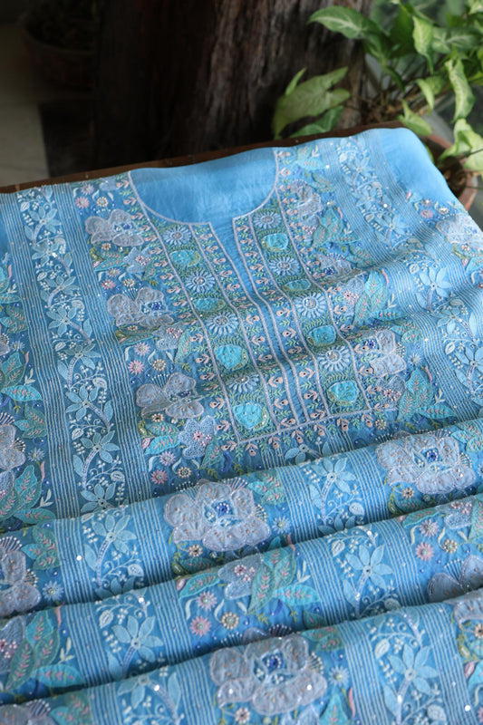 Blue Shade Organza Silk Chikankari Unstitched Fabric