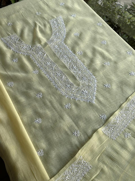 Yellow Tissue Silk Chikankari Unstitched Fabrics