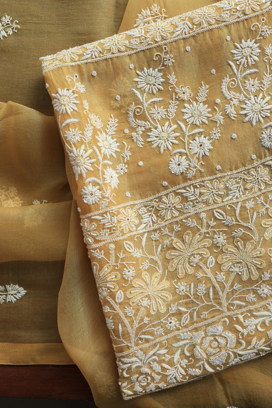 Mustard Paper Tussar Resham Chikankari Unstitched Kurta Dupatta Set