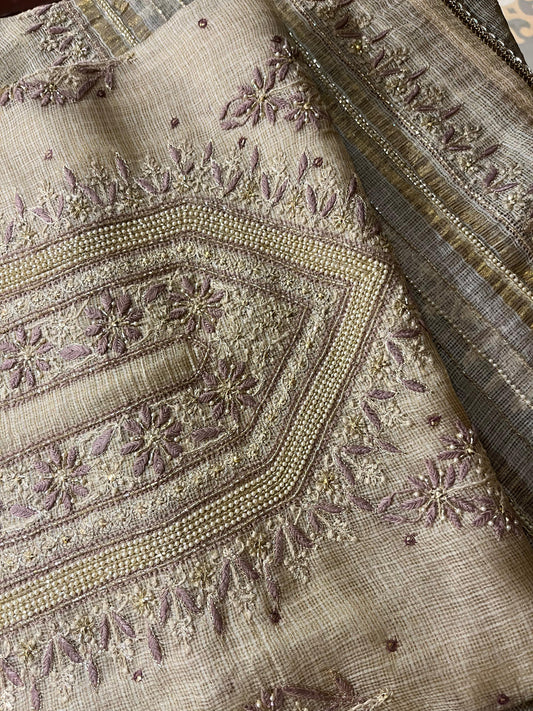 Beige Mauve Tissue Kota Chikankari Unstitched Fabric