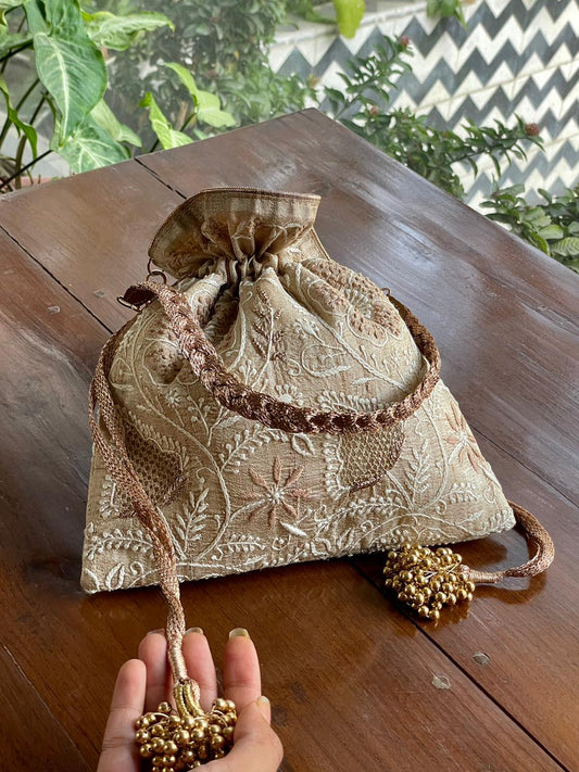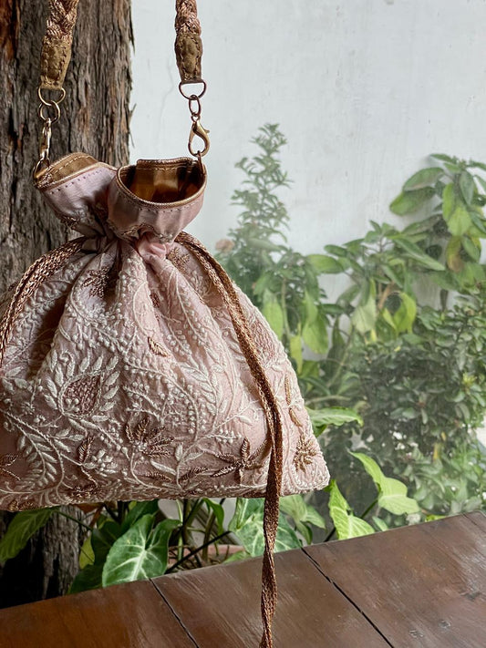 Baby Pink Shade Beige Raw Silk Chikankari Polti Bags