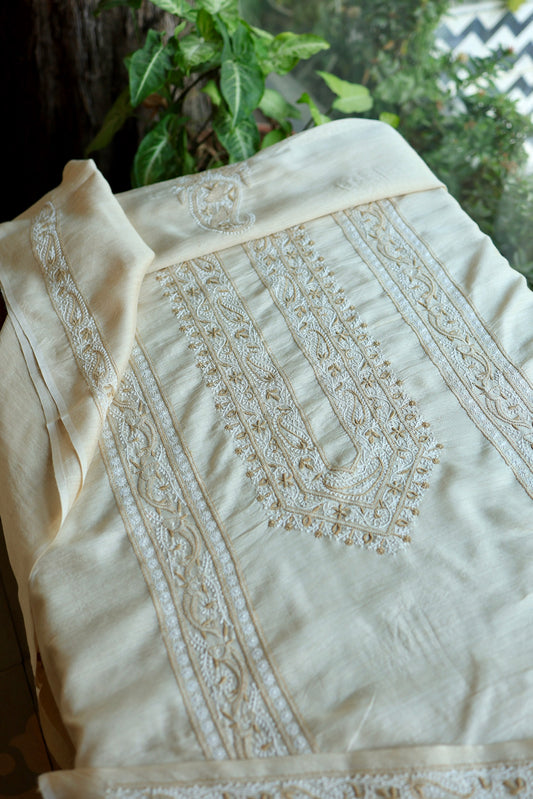 Natural Beige Shade Paper Tussar Resham Chikankari Unstitched Kurta Dupatta Set