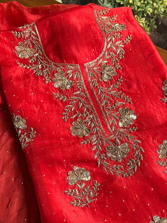 Red Chanderi Silk Mukaish Badla Unstitched Fabrics