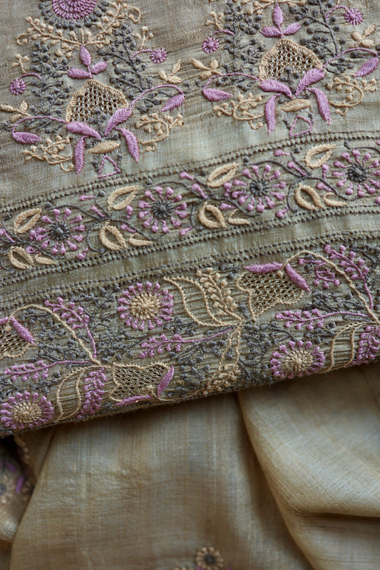 Natural & Mauve Shade Tussar Silk Natural Shade With Multi Thread Chikankari Fabric