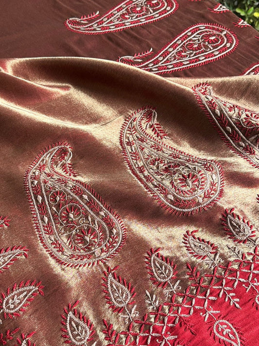 Red & Golden Shade Saman Tissue Silk Fine Chikankari Shawl