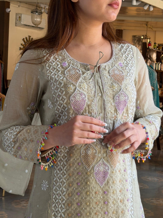 Grey Blue Shade | Tissue Silk Chikankari Work Kurta Set
