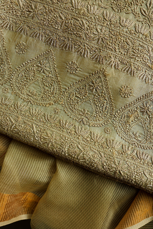 Beige Green Tissue Kota Chikankari Unstitched Fabric