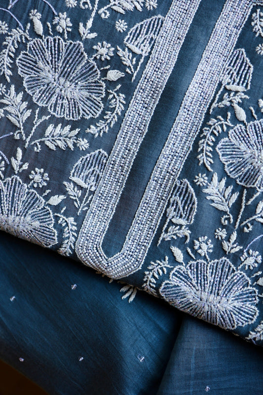 Dusty Teal Pearl Work Chikankari Unstitched Fabric