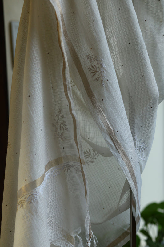 Kota White Chikankari Mukaish Kamdani Dupatta With Tissue Border