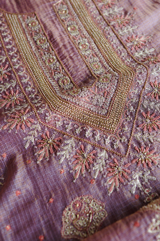Lavender Shade Rasm Silk Chikankari With Ari Work Unstitched Kurta Dupatta Set