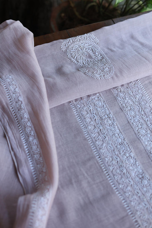 Baby Pink All Over Chikankari Malmal Unstitched Men's Kurtas Fabric