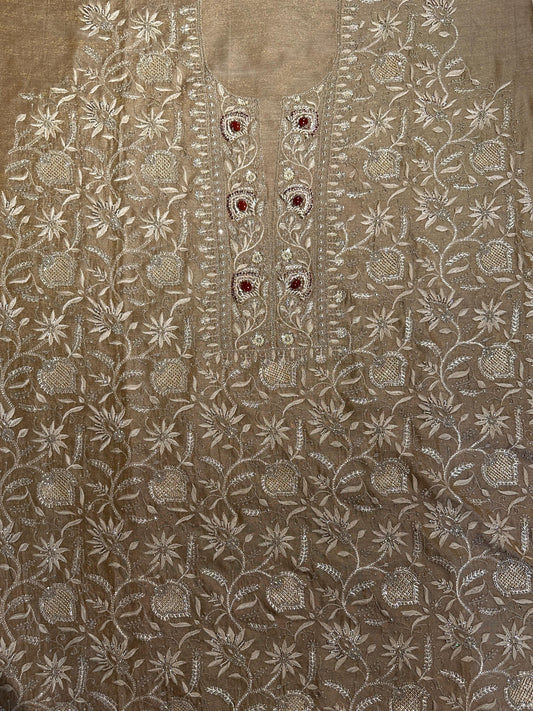 Dark Beige Shade Paper Tussar Resham Chikankari Unstitched Kurta Dupatta Set