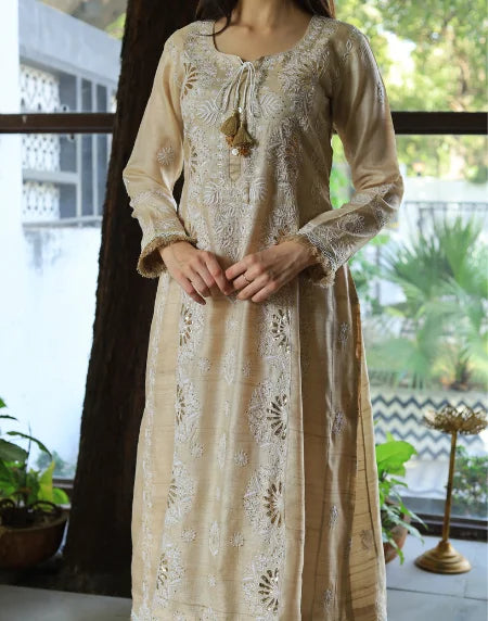 Beige Noor Organza Silk Chikankari Straight Cut Kurta Dupatta Set