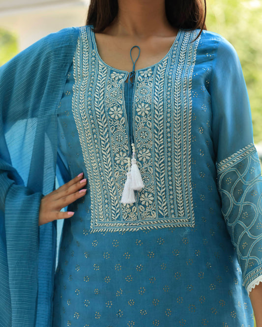 Blue Mukaish Kamdani Noor Organza Chikankari Kurta Set