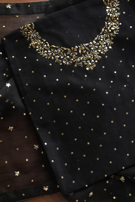 Black Chanderi Silk Mukaish Badla Unstitched Fabrics