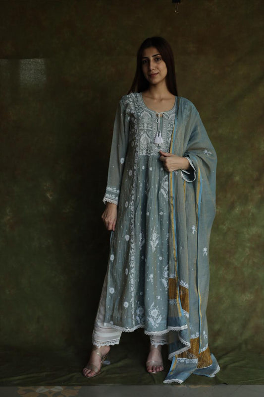 Cloud Grey Tissue Silk Chikankari Angarkha With Ari & Beads Work