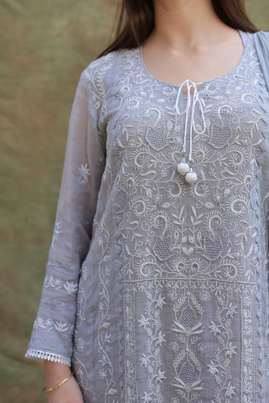 Grey Soft Mulmul Mirror Work X Chikankari Kurta Set
