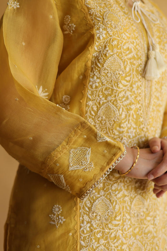 Mustard Noor Organza Silk Chikankari Straight Cut Kurta Dupatta Set