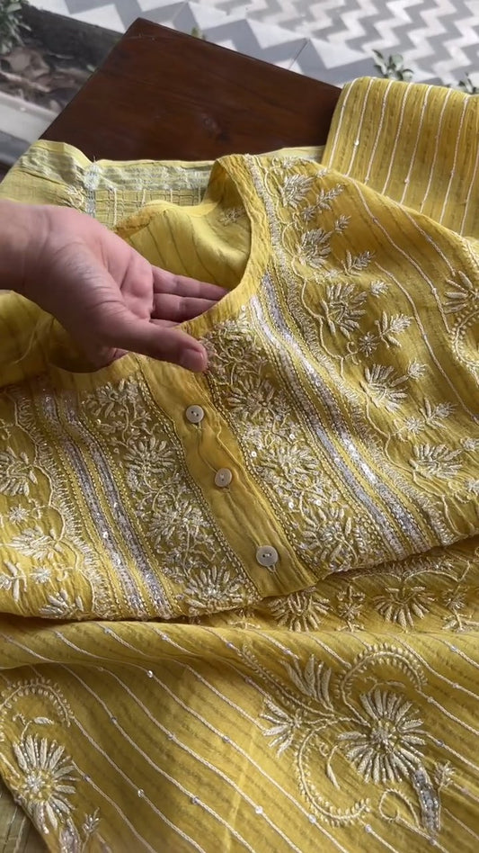 Pastel Yellow Soft Malmal Stripe Pattern Pearl Work Chikankari Kurta Set
