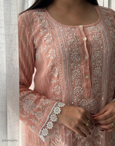 Peach Soft Malmal Stripe Pattern Pearl Work Chikankari Kurta Set