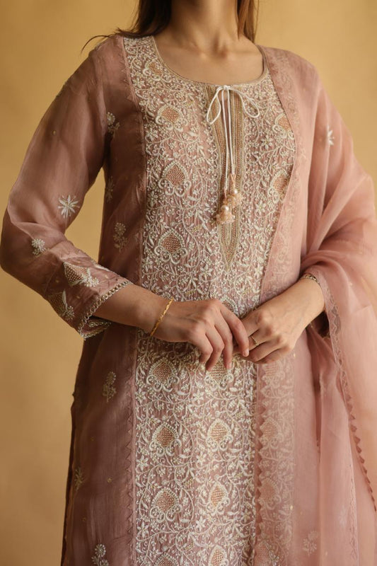 Rose Gold Noor Organza Silk Chikankari Straight Cut Kurta Dupatta Set