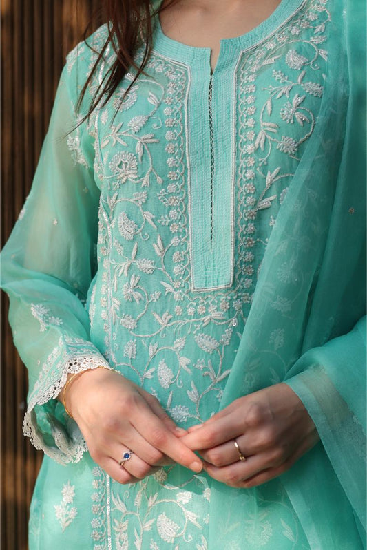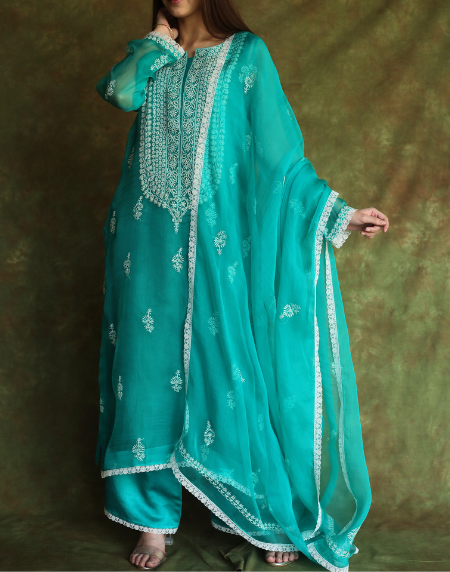 Teal Green Mukaish Kamdani Noor Organza Chikankari Kurta Set