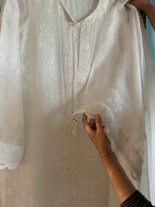 Swan White | Noor Organza Silk Chikankari Straight Cut Kurta Dupatta Set