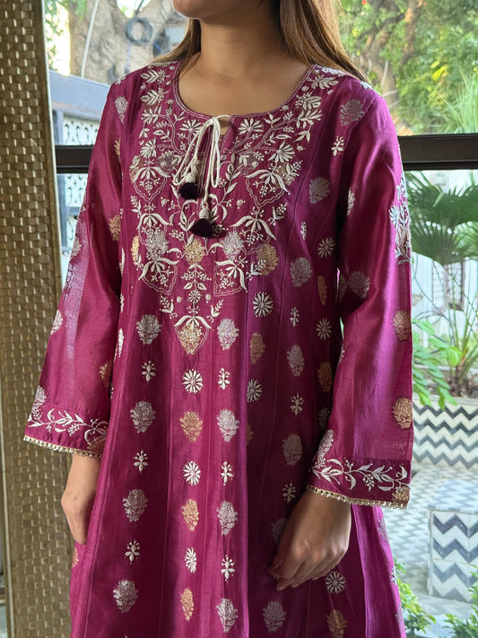 Plum Pink Zari Chanderi Chikankari Co-Ord Set