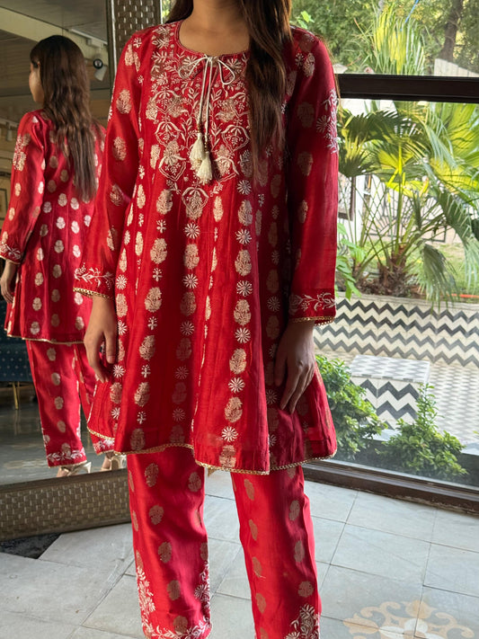 Red Zari Chanderi Chikankari Co-Ord Set