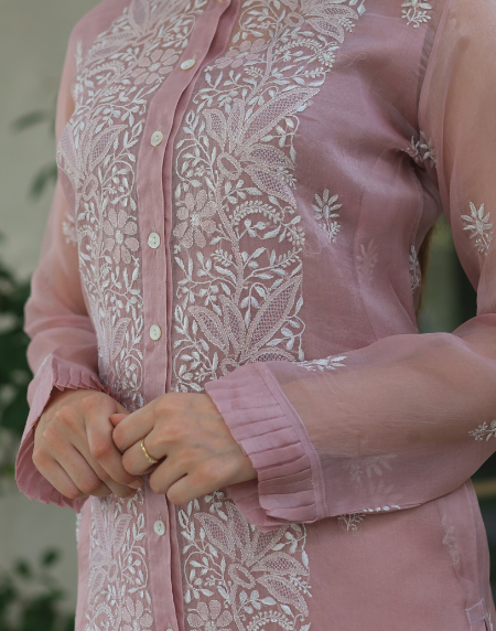 Baby Pink Noor Organza Resham Chikankari Short Top With Bow Tie