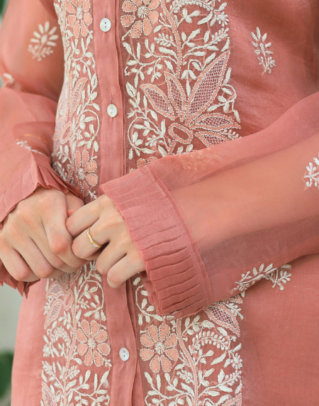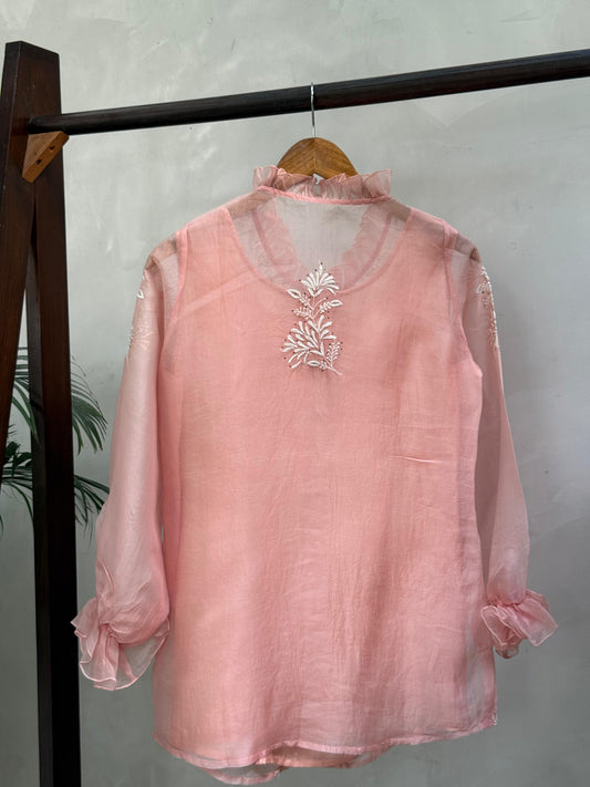 Peach Noor Organza Chikankari Frill Collar Ready To Wear Short Top