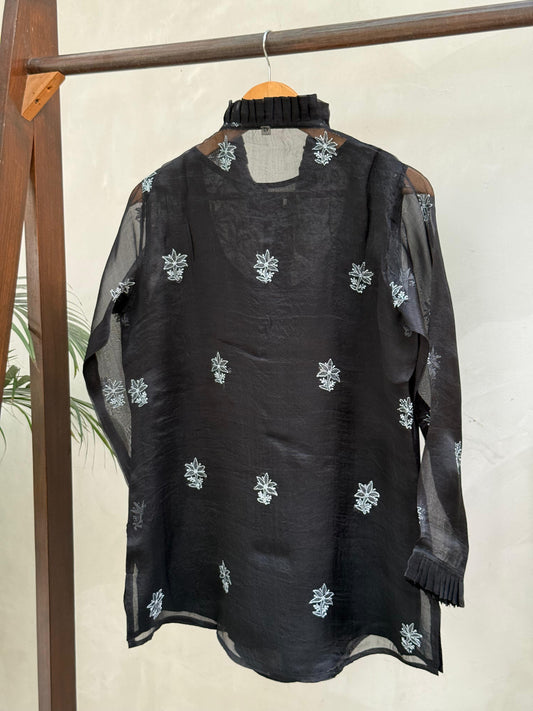 Black Noor Organza Chikankari Frill Collar Ready To Wear Short Top