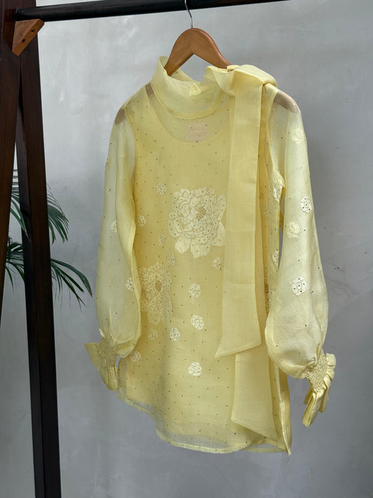 Lemon Noor Organza Resham Chikankari Short Top With Bow Tie