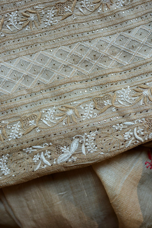 Natural Beige Tussar Silk Chikankari Fabric With Mukaish Kamdani