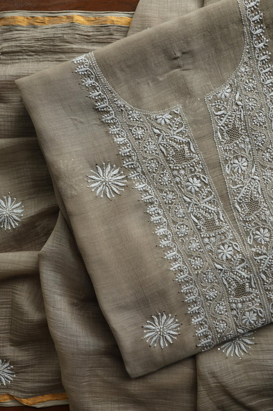 Greyish Blue Paper Tussar Resham Chikankari Unstitched Kurta Dupatta Set