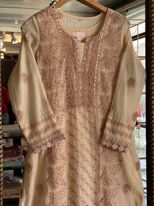 Beige Shade Malmal Mukaish Kamdani Chikankari Stitched Kurta Dupatta Set