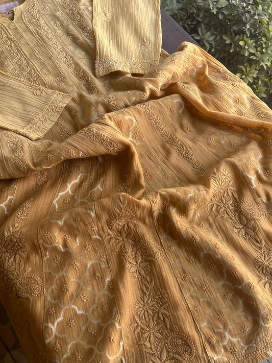 Natural Paper Tussar Resham Chikankari Unstitched Fabric Kurta Dupatta Set