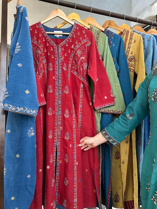 Crimson Red Shade Saman Pashmina Resham Thread Chikankari Shawls