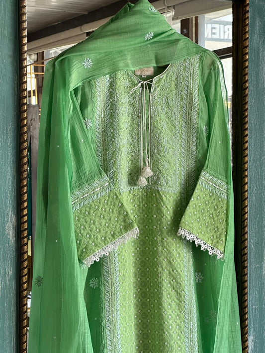 Fluorescent Green Jacquard Pearl Work Chikankari Kurta With Dupatta