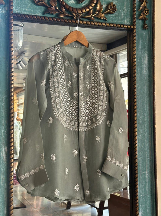 Green Noor Organza Chikankari Collar Ready To Wear Short Top