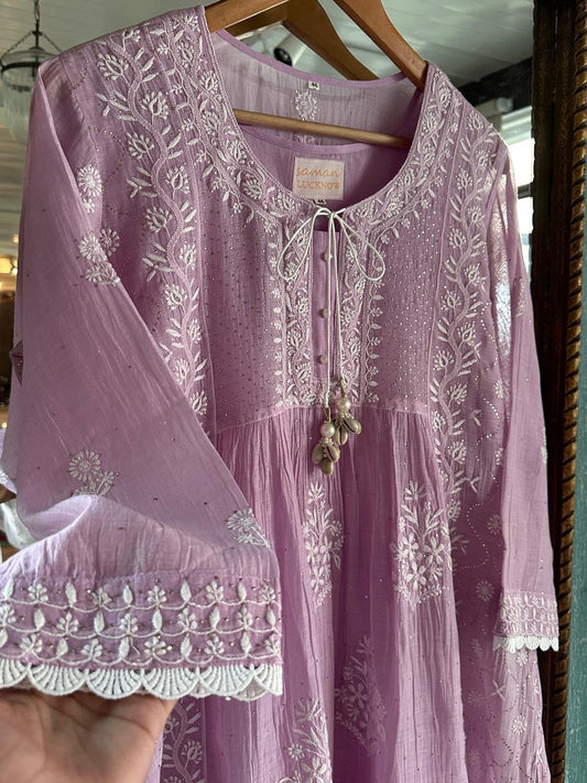 Lavender Shade Malmal Mukaish Kamdani Chikankari Stitched Kurta Dupatta Set