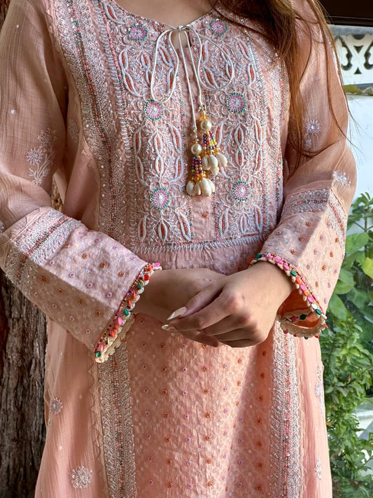 Coral Peach Shade Jacquard Sequins Chikankari Kurta Set