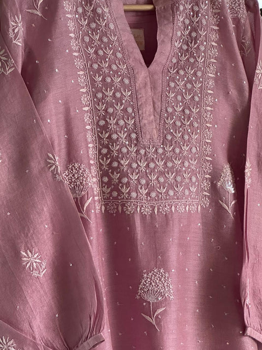 Baby Pink Malmal Mukaish Kamdani Chikankari Stitched Kurta Dupatta Set