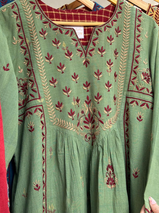 Dark Green Shade Saman Pashmina Resham Thread Chikankari Shawls