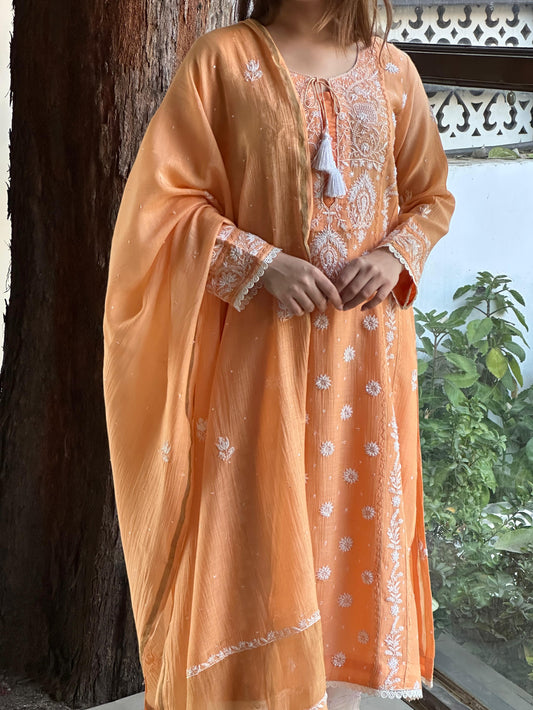 Soft Pink Mulmul Pearl White Chikankari Ready to Wear Kurta Set
